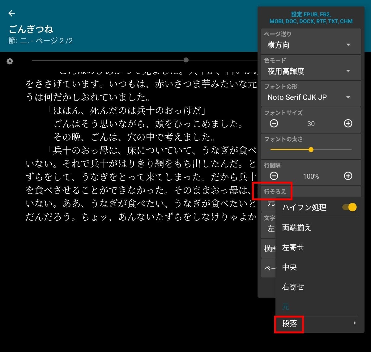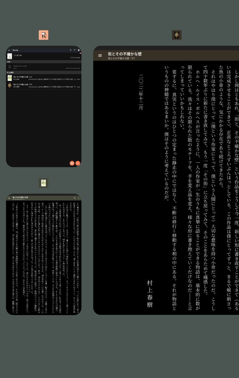 PDF、EPUB、Microsoft Word (DOC, DOCX, RTF)、Kindle (MOBI, AZW3) 、DJVU、FB2、TXT、ODT、CHM 形式の文書を読むことが出来ます。