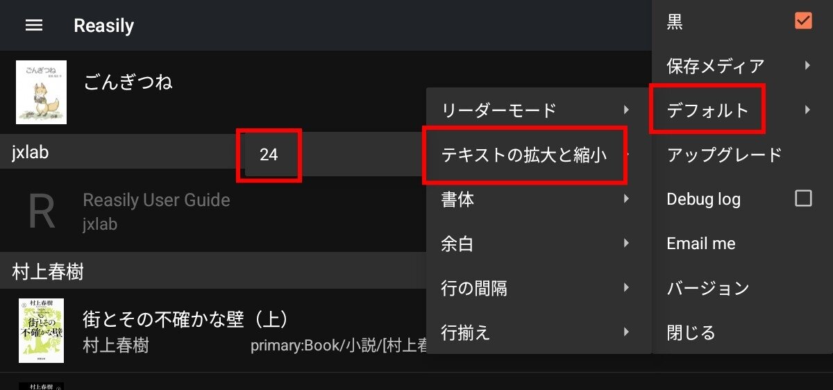 本を読む画面でもフォントの大きさが変えられますが、読んでいる本限定の設定になります。