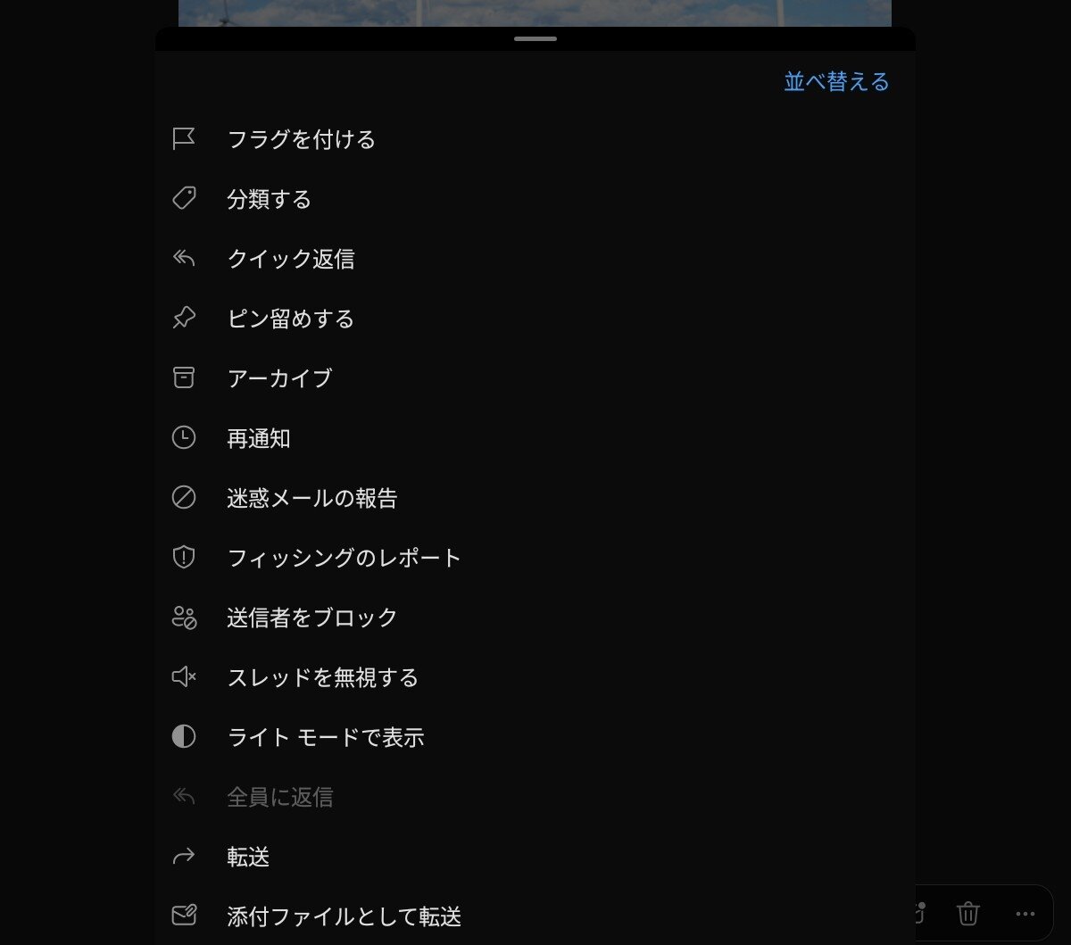 右下のメニュー(三点ドット)から各種処理を行います。スパムは「送信者をブロック」にすると次回から自動的に迷惑メールとして処理されます。