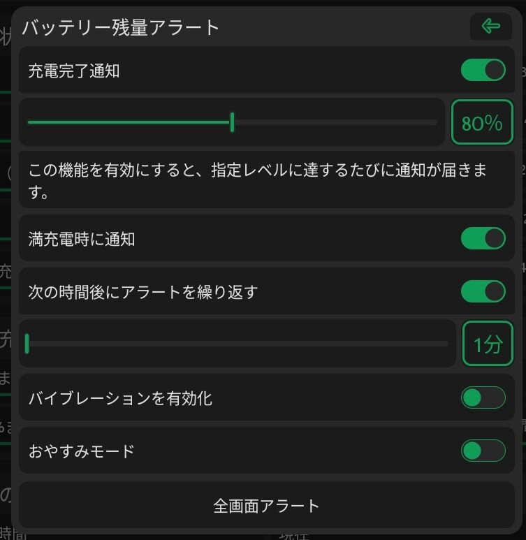 バッテリーの通知は別のアプリを使っている。バッテリーが急激に無くなる原因が分かるかもしれないので通知をオフにして使ってみる。