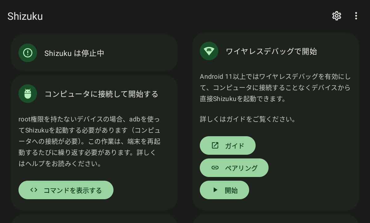 Playストアから「Shizuku」をインストールする。