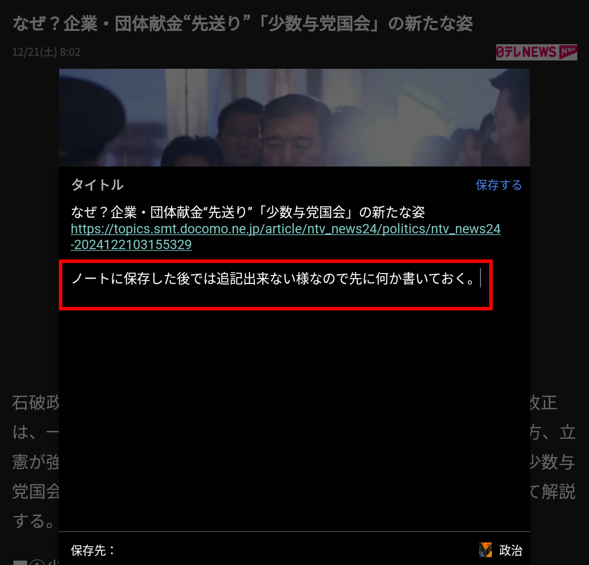 他のアプリの共有機能でこのアプリのノートに保存出来ます。これは政治という名前のノートに保存するところです。どのノートに保存するかはここで選択出来ます。