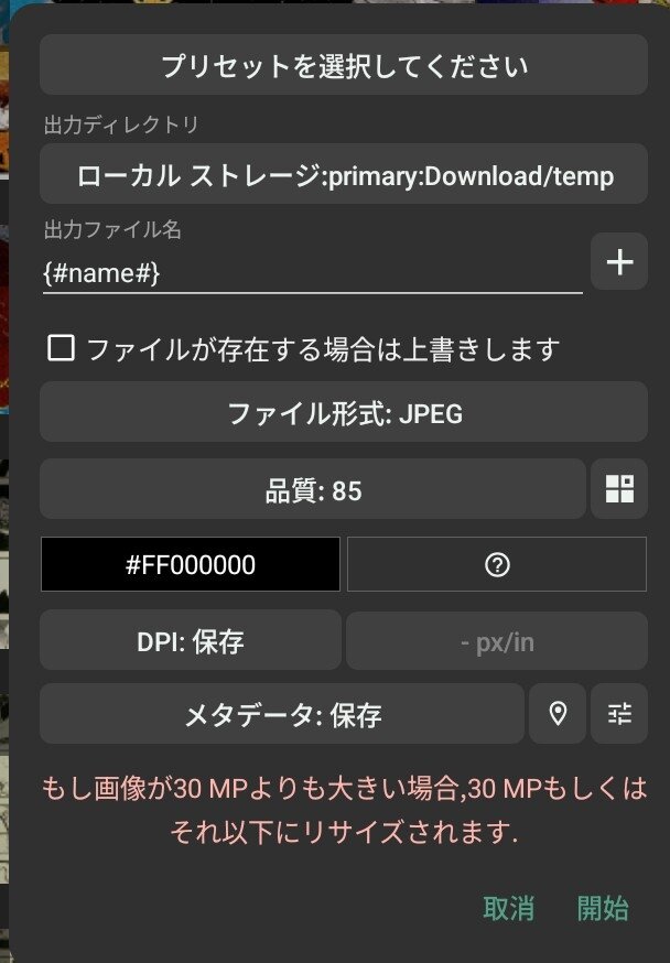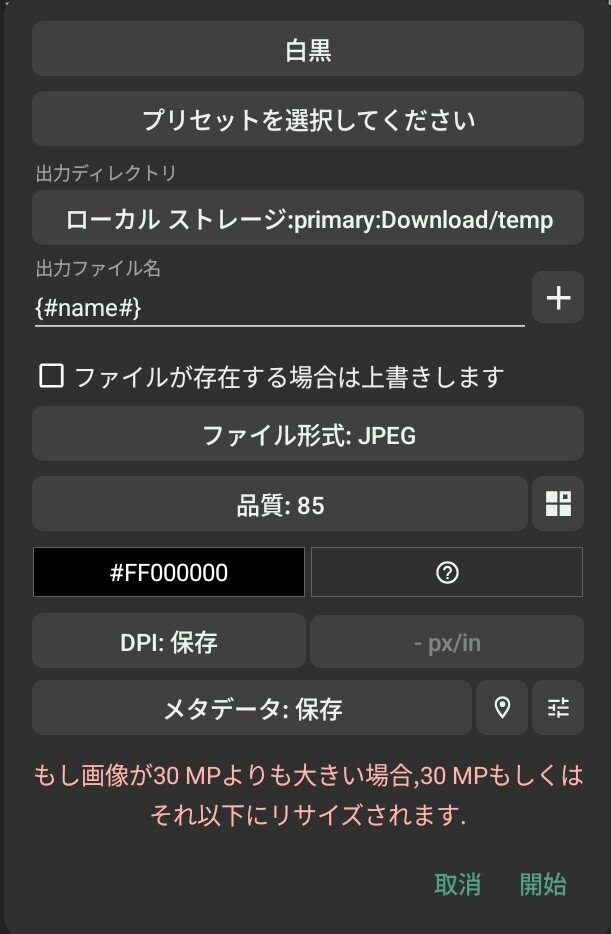 「プリセット」、「出力ディレクトリ」などを入力し、「開始」をタップする。